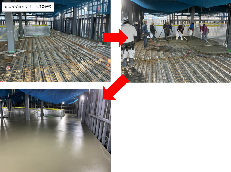 また、2階スラブのコンクリート打設も完了し、建物の形がより明確になってきています。