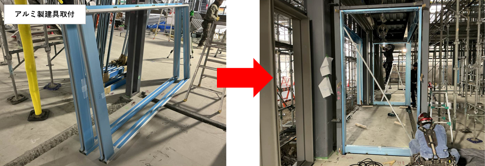 また、建物開口部ではアルミ製建具の取付作業が進んでいます。