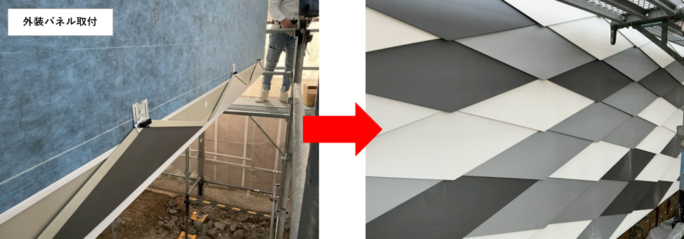 (仮称)トヨタカローラ静岡㈱千代田店建設工事では、外壁工事が進み、外壁にはメタル素材の外装パネルの取り付けを行いました。