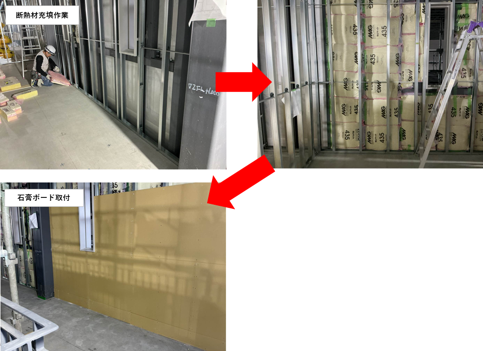 建物内部では、断熱材としてグラスウールを充填し、その上から石膏ボードを施工する作業を行っています。