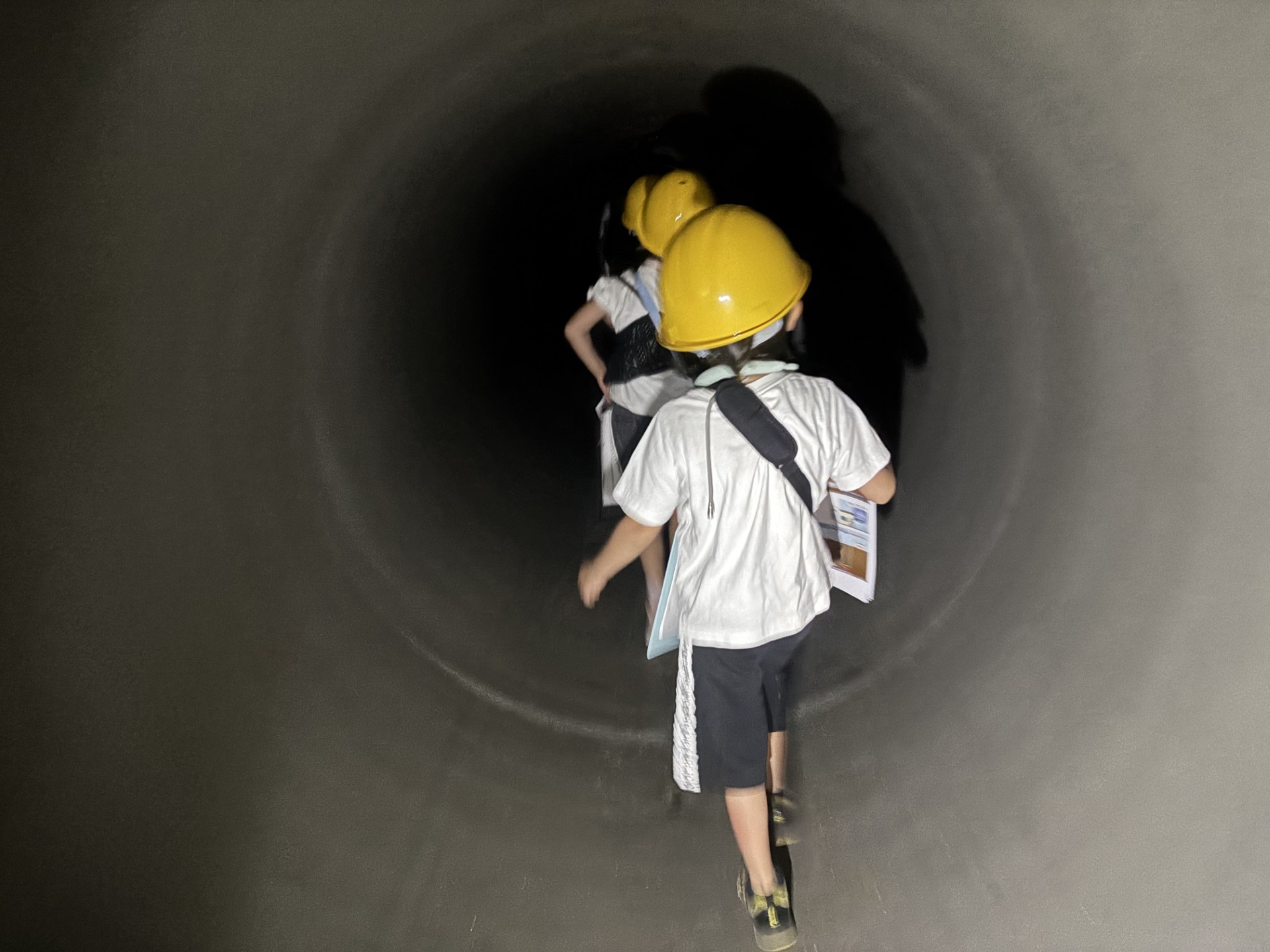 その後、実際に大きな管の中(高さ1.5M、長さ82.0M)を歩く体験をすると、「トンネルみたい!」「真っ暗で少し怖い…」「涼しい!」「すごい!」と大興奮。